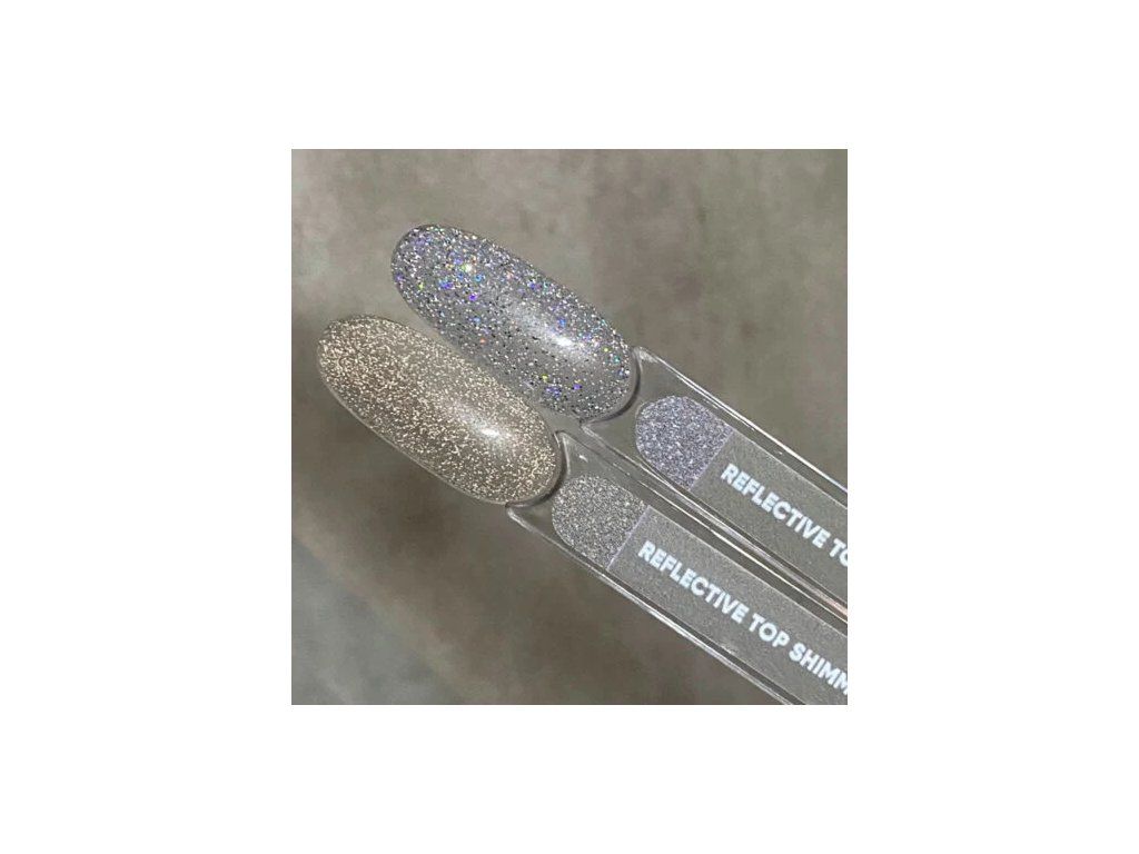 NAILSOFTHEDAY Reflective top holographic – světloodrazný holografický top bez lepivé vrstvy. Holografický shimmer neuvěřitelně krásně odráží každý paprsek světla, shimmer je mikrojemný, vysoké kvality, jasně září. Díky moderní formuli NAILSOFTHEDAY Reflective top holographic se výborně vyrovnává a pevně pokrývá nehtovou ploténku. Předchází odlupování a poškrábání. Zachovává sytou barvu materiálů a stabilní lesk až čtyři týdny. Nežloutne. Střední konzistence.