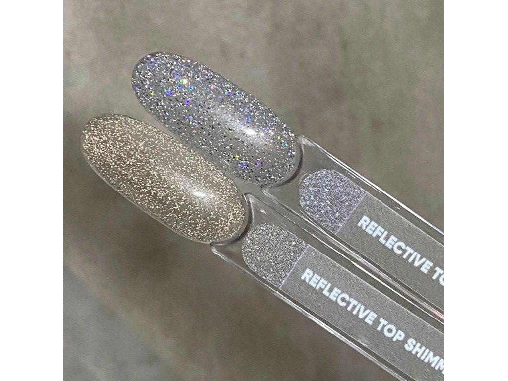 NAILSOFTHEDAY Reflective top Shimmer – světloodrazný holografický top bez lepivé vrstvy. Holografický shimmer neuvěřitelně krásně odráží každý paprsek světla, shimmer je mikrojemný, vysoké kvality, jasně září. Díky moderní formuli NAILSOFTHEDAY Reflective top Shimmer se výborně vyrovnává a pevně pokrývá nehtovou ploténku. Předchází odlupování a poškrábání. Zachovává sytou barvu materiálů a stabilní lesk až čtyři týdny. Nežloutne. Střední konzistence.