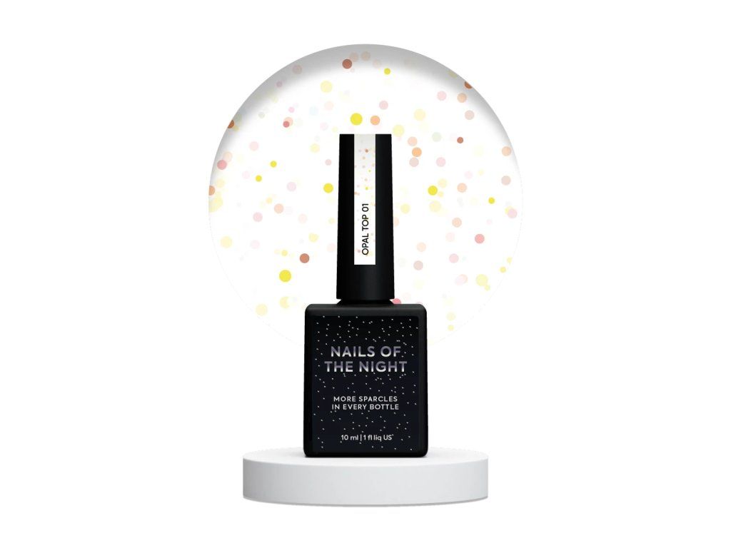 NAILSOFTHENIGHT Opal top 01 — konečný povlak s opálovými třpytkami na transparentním základu, bez lepivé vrstvy a bez UV filtrů na nehty, 10 ml