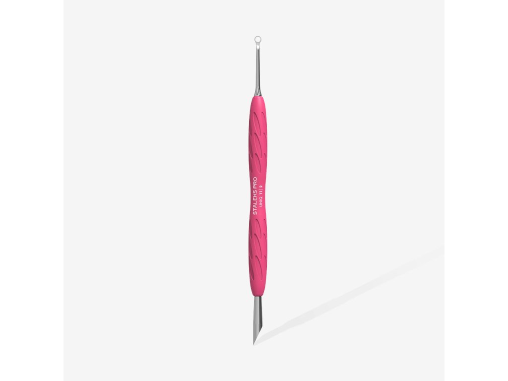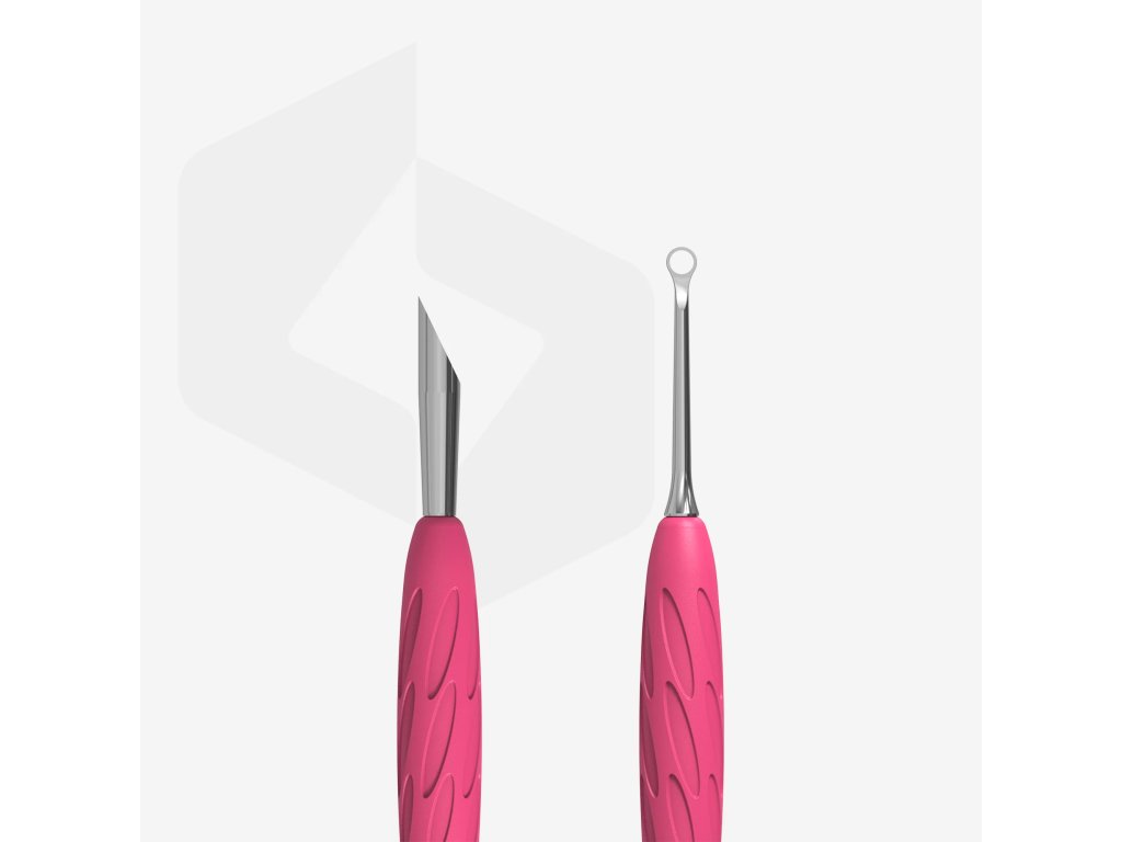 - Pracovní část "šikmý zatlačovač" slouží k nadzvednutí a zatlačení hrubé a silně přilnavé kůžičky, k očištění volného okraje nehtu, k odstranění stékajícího gel-laku.