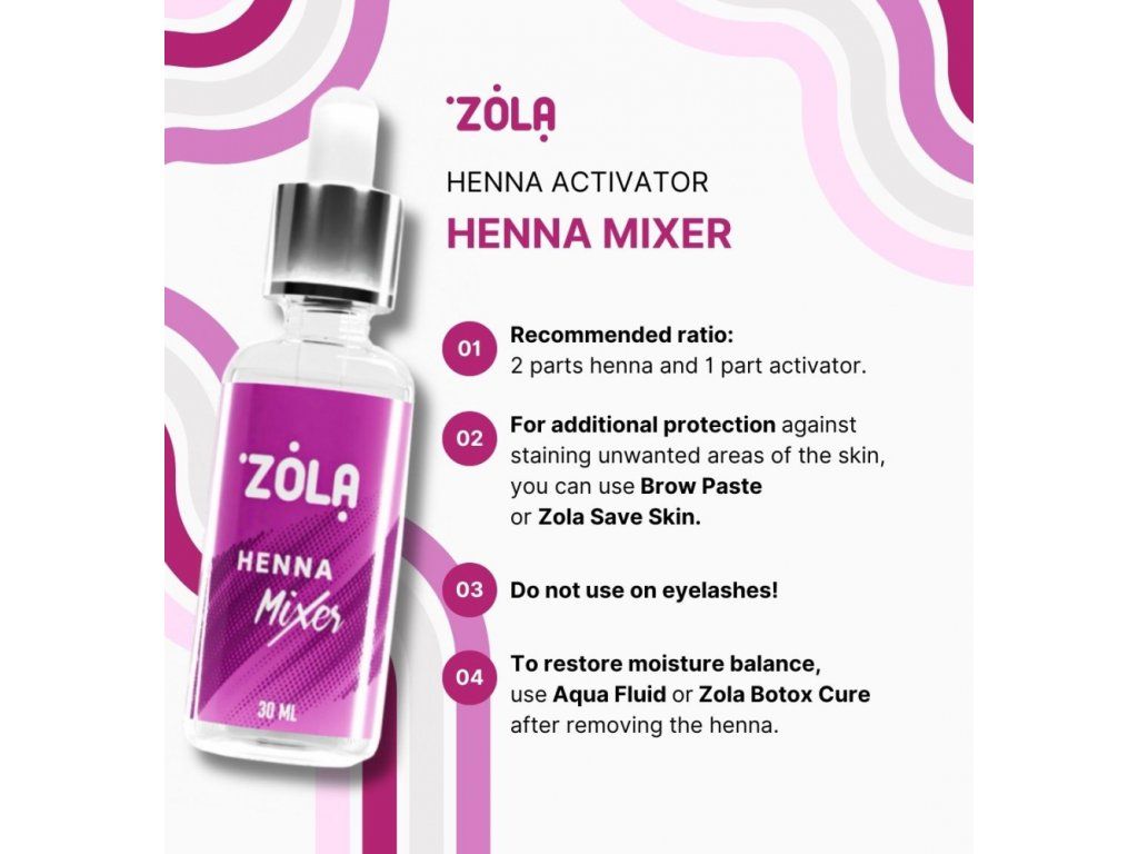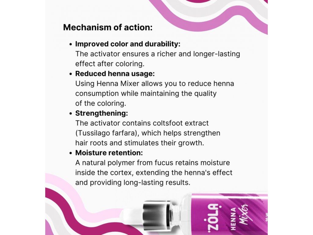Aktivátor henny ZOLA je nepostradatelnou součástí pro práci s hennou. S jeho použitím můžete dosáhnout zářivější barvy a trvanlivějšího zbarvení! Produkt snižuje spotřebu henny a další složka z podbělu posiluje vlasové kořínky. Přírodní polymer z fukusu udržuje vlhkost uvnitř kortexu a prodlužuje účinek henny. Díky tomu je barvení stabilnější a dlouhotrvající. Návod k použití: Smíchejte hennu v nekovové nádobě s aktivátorem v poměru 2:1. Důkladně promíchejte, dokud nevznikne homogenní konzistence. Zahajte proces barvení a striktně dodržujte dobu působení.